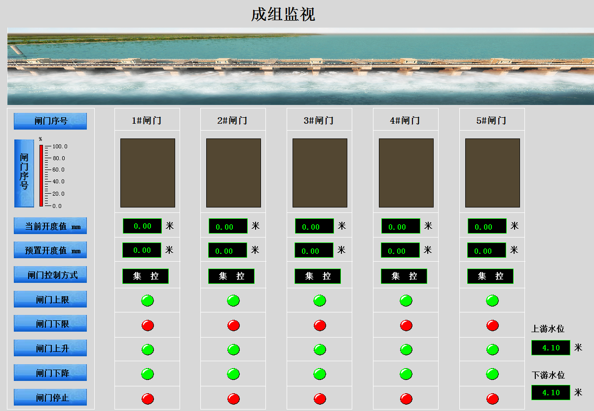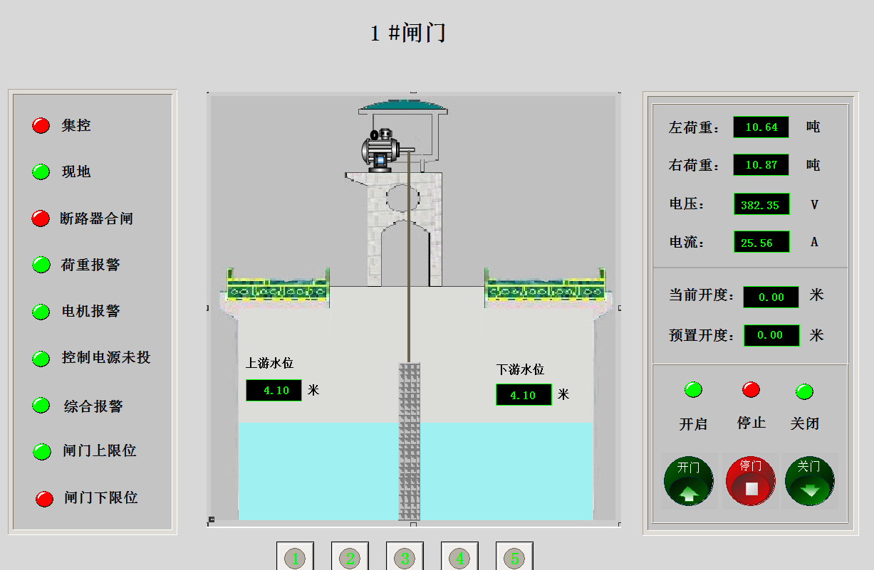 實時監視控制閘門的狀態和數據,通過開關顏色狀態查看集控,現地,斷路器合閘,荷重報警,電機報警,控制電源未投,綜合報警,閘門上限位,閘門下限位的開關狀態,通過畫面可以查看左荷重,右荷重,電壓,電流,當前開度實時數據,通過設置預置開度調節水位,并可以開啟和關閉閘門。