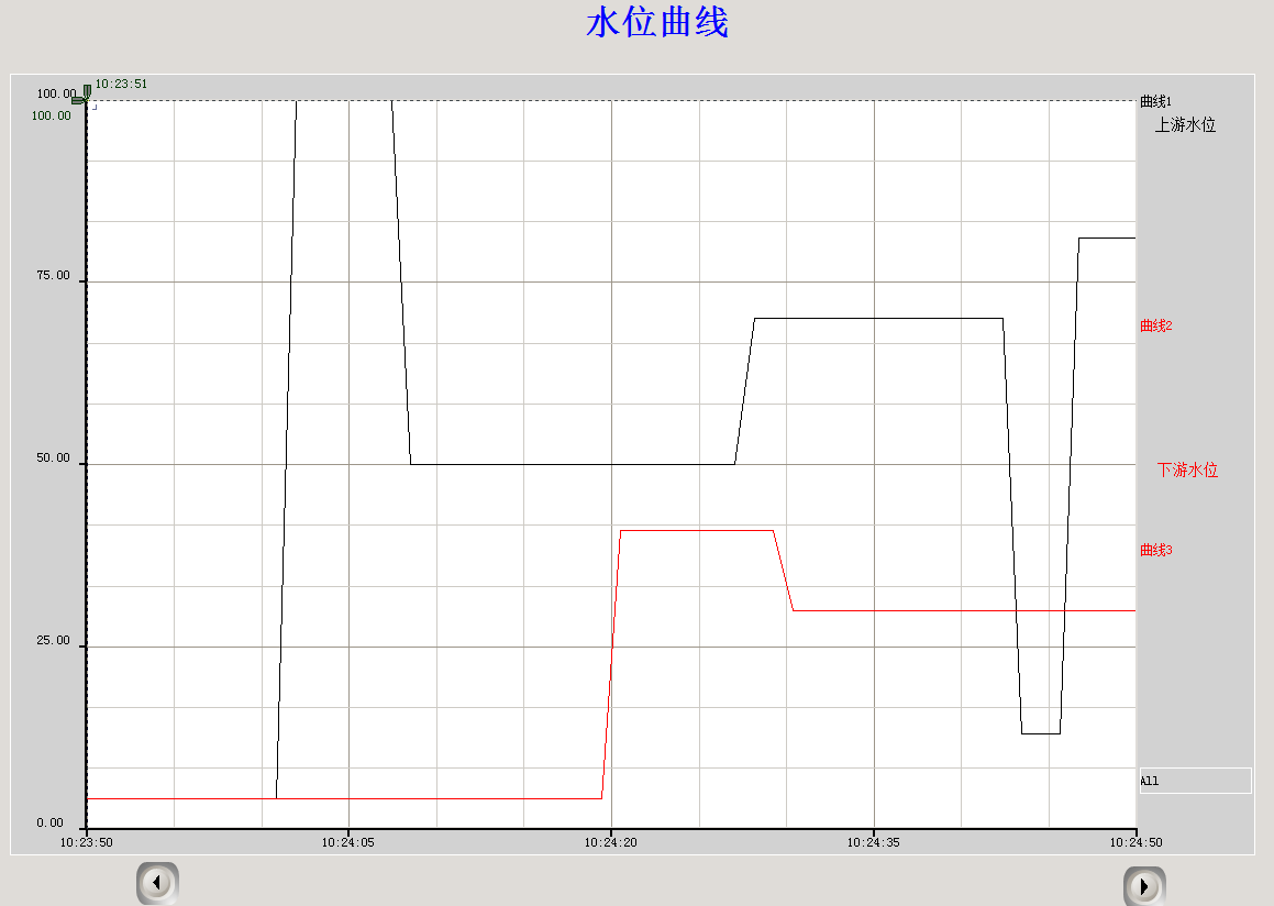 通過實時曲線可以查看水位的實時數據和趨勢走向,還可以通過曲線下面的按鈕向前向后調節坐標軸的時間,查看其它時間的水位情況。