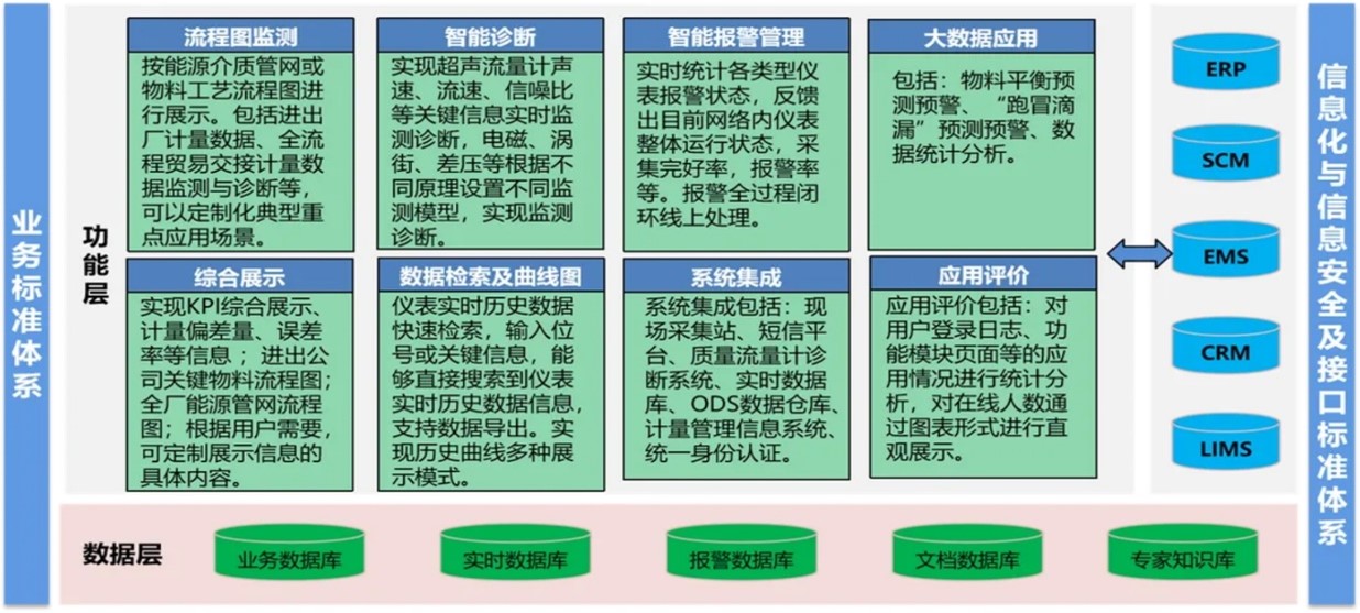 系統(tǒng)具備標(biāo)準(zhǔn)化輸出接口或數(shù)據(jù)共享接口,為上位管理系統(tǒng)提供數(shù)據(jù)集成服務(wù),可以把計量儀表實時狀態(tài)信息、儀表在線率、采集完好率、報警率、處理結(jié)果信息推送到上層應(yīng)用系統(tǒng);把系統(tǒng)產(chǎn)生的重要報警推送給上位管理系統(tǒng),同時通過計量管理信息系統(tǒng)、MES系統(tǒng)等獲取基礎(chǔ)信息,用戶維護一套臺賬,通過接口實現(xiàn)信息共享調(diào)用。