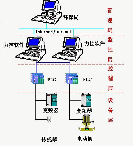 為了保證污水處理廠自動控制系統(tǒng)的穩(wěn)定性和可靠性,設(shè)計中采用了四級控制和管理方案對整套污水處理系統(tǒng)進(jìn)行監(jiān)控,管理層可實時監(jiān)測污水處理的運行狀況,有助于管理層做出正確的規(guī)劃。監(jiān)控層選用兩臺工業(yè)控制計算機(jī)進(jìn)行冗余,實時觀察設(shè)備的運行狀況。控制層選用西門子公司PLC(S7400+S7300+S7200)做為控制器,充分顯示了“集中監(jiān)測,分散控制”的原則。設(shè)備層采用了運行記錄儀、超聲波流量計、COD在線測試儀、PH(工業(yè)酸度)在線測試儀、變頻控制器等,并配備相應(yīng)的軟件,確保可靠、有效地運行。