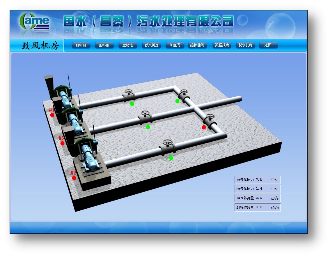 鼓風機房負責對反應池進行鼓風曝氣,該鼓風機房設置3臺鼓風機,兩用一備。需要檢測閥門、鼓風機狀態等參數。