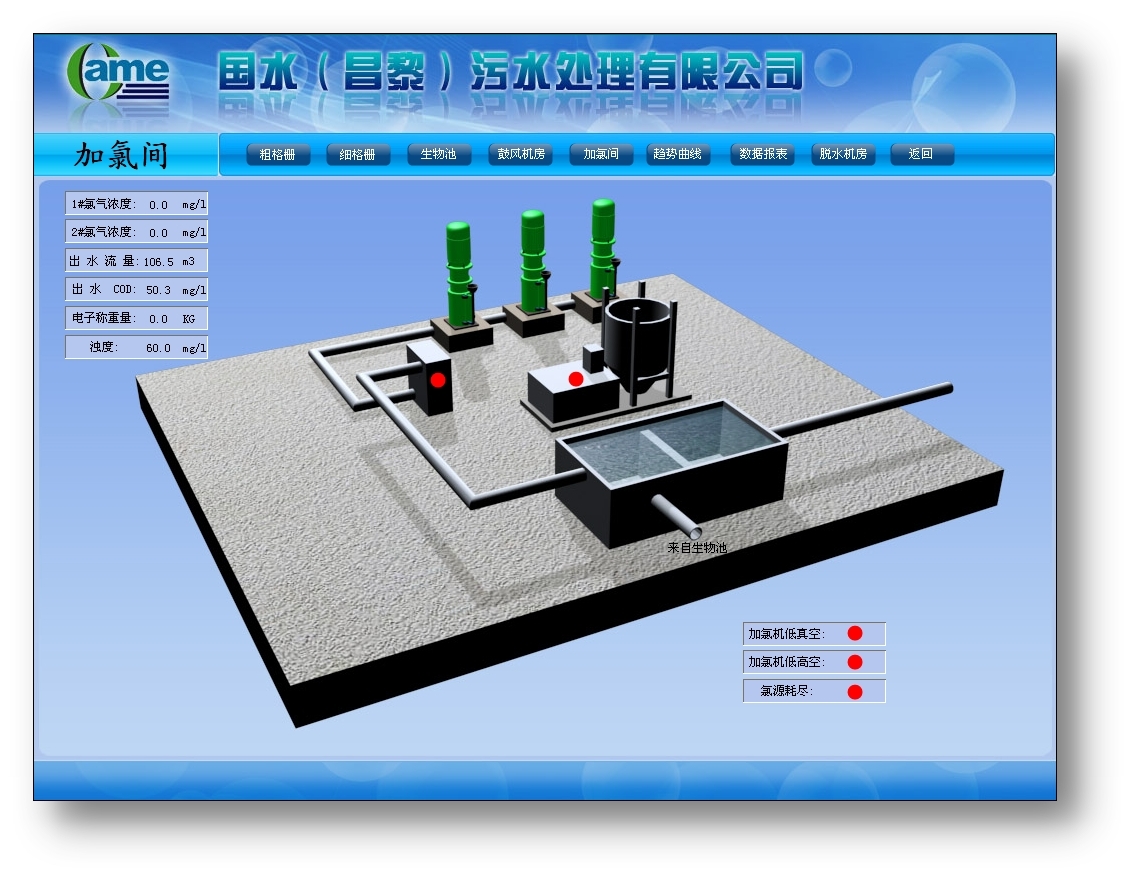 污水出廠前采用液氯消毒,經接觸池后出水由管道排向大海。需要監測加氯機狀態、氯氣濃度、氧氣濃度、出水流量、出水cod、電子秤重量、濁度等參數。