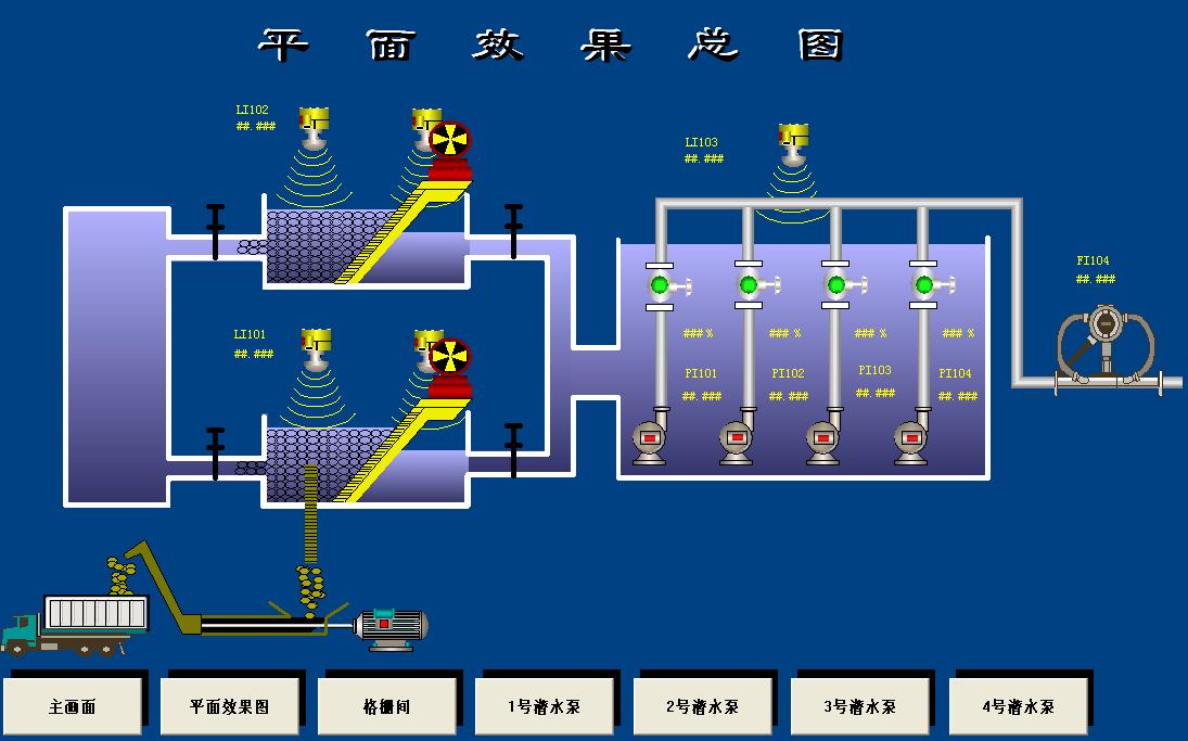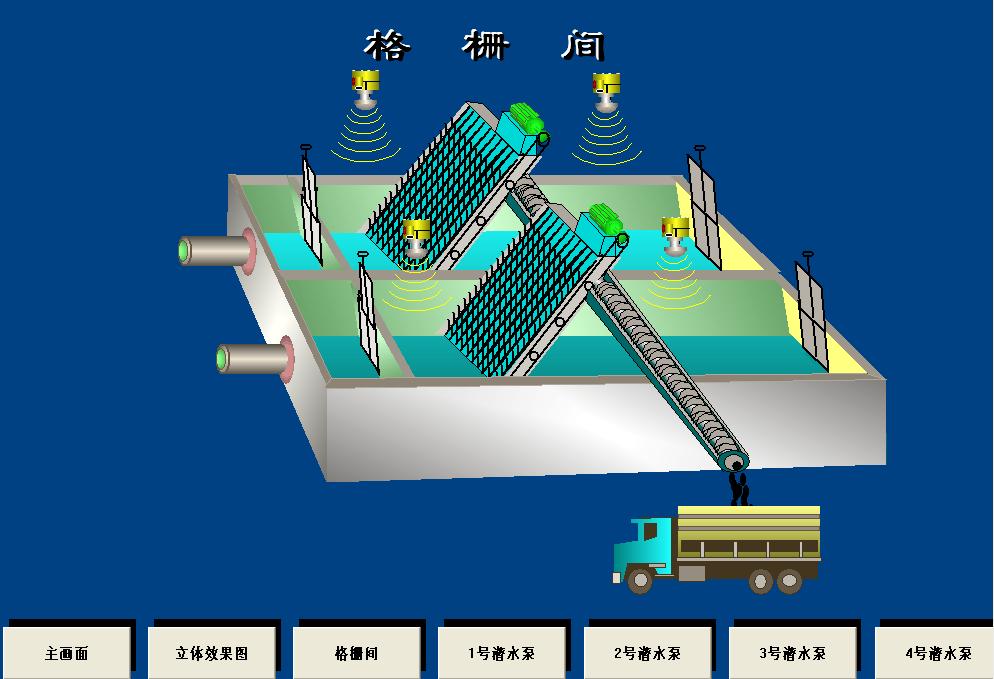 系統(tǒng)提供用于操作數(shù)據(jù)和非正常情況有效通訊的操作員界面。所有過程變量的數(shù)值和狀態(tài),動態(tài)刷新。下圖是粗格柵及潛水泵房的立體和平面界面: