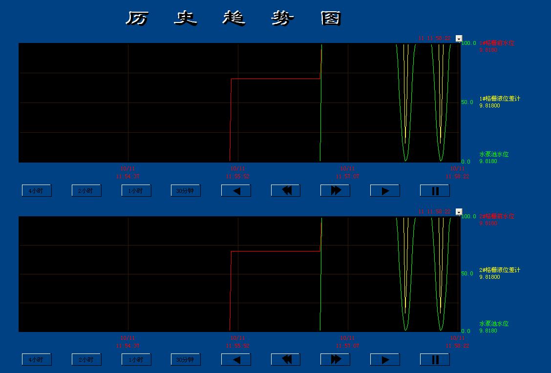 趨勢顯示包括歷史顯示和實時顯示等功能。趨勢顯示的形式,包括數(shù)字、棒圖顯示等多種實時或歷史的趨勢,直觀易看,供調(diào)度員分析比較,找出泵站的黃金運行規(guī)律和分析事故原因,改進管理方法。對于每一幅趨勢圖,操作員能對點的數(shù)量結(jié)合時間范圍進行在線組態(tài),以及在線縮放趨勢曲線。系統(tǒng)提供滾動條用來使趨勢曲線在歷史記錄中向前或向后移動。單選某一個參數(shù)時,可以顯示該參數(shù)的全部信息以及實時趨勢和歷史趨勢。在同一趨勢圖上,可顯示至少二個變量的趨勢記錄曲線。