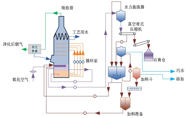 脫硫液在吸收塔內(nèi)和SO2充分反應(yīng)后,經(jīng)漿液排出泵進(jìn)入氧化塔酸化氧化,氧化塔內(nèi)同時(shí)鼓入氧化風(fēng)和酸化煙氣,酸化煙氣將剩余的脫硫漿液充分反應(yīng)后生成亞硫酸鈣,然后與氧化風(fēng)反應(yīng)生成硫酸鈣,經(jīng)過真空帶式過濾機(jī)過濾,得到成品石膏。