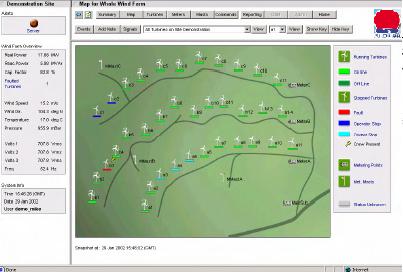③ 系統顯示各風電機組的運行狀態。如開機、停車、調向、手/自動控制以及大/小發電機工作等情況,通過各風電機組的狀態了解整個風電場的運行情況。