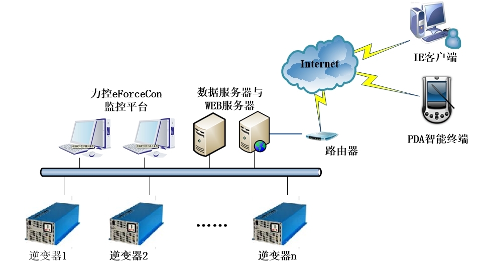 光伏逆變器/通信模塊可通過光纖、以太網(wǎng)、RS485總線等任意形式連接至主控室的上位機操作員站,實現(xiàn)監(jiān)控整個光伏系統(tǒng),系統(tǒng)架構(gòu)圖如下:
