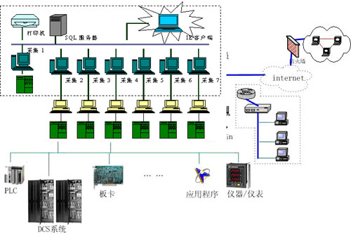 采集系統分為服務器和客戶端,服務器可采用RTDB進行采集,主要功能有:工業現場實時數據采集、數據歷史保存、報警數據的存儲;客戶端主要完成實時數據顯示、歷史數據查詢、報表查詢、報警信息查詢、報警處理、故障排除、曲線和棒圖繪制。電廠采集系統可以與企業的MES等系統連接。如下圖: