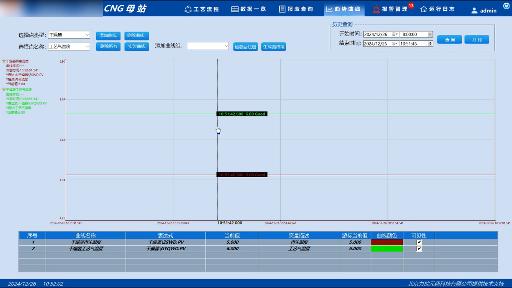 CNG加氣母站站控系統通過集成壓縮機升壓、工藝管道控制、加氣機管理等子系統,實現了天然氣壓縮、凈化、儲存及加注等過程的全面自動化控制,借助遠程數據采集與智能診斷顯著提升生產效率和設備可靠性,有效降低人工操作強度與失誤率。系統支持實時/歷史趨勢圖分析功能,操作人員可通過動態曲線對比歷史同期數據,追蹤壓縮機溫度、壓力等關鍵參數變化趨勢,并可將多組曲線組合保存以便快速調用,助力系統持續優化運行。