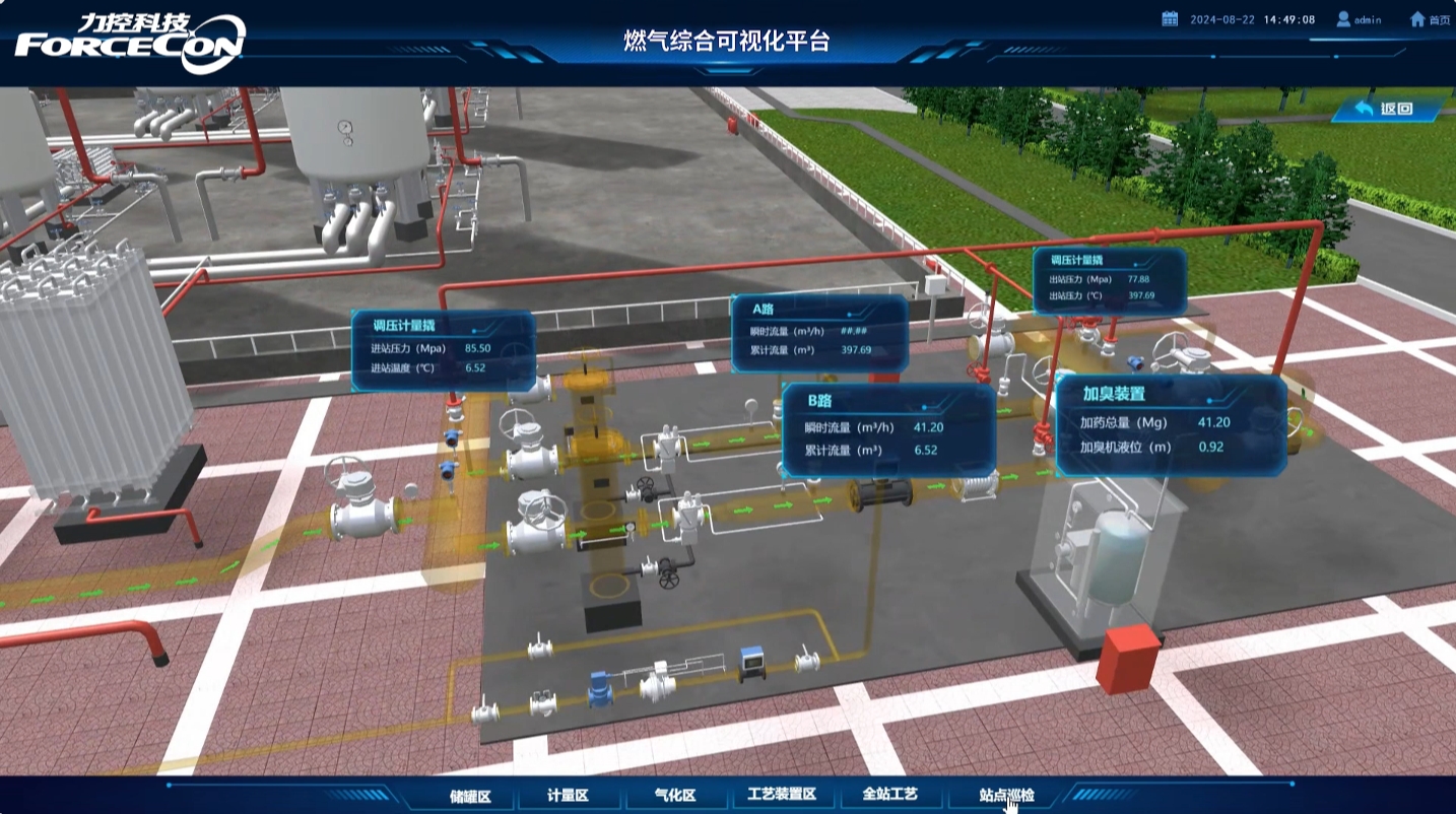 力控天然氣場站綜合管理系統(tǒng)的全流程工藝監(jiān)控,可直觀展示場站設(shè)備布局與實時運行狀態(tài),支持動態(tài)更新壓力、溫度、流量、瞬時值、累積值、計劃值等關(guān)鍵參數(shù),顏色變化與動態(tài)移動效果可直觀反映異常波動。