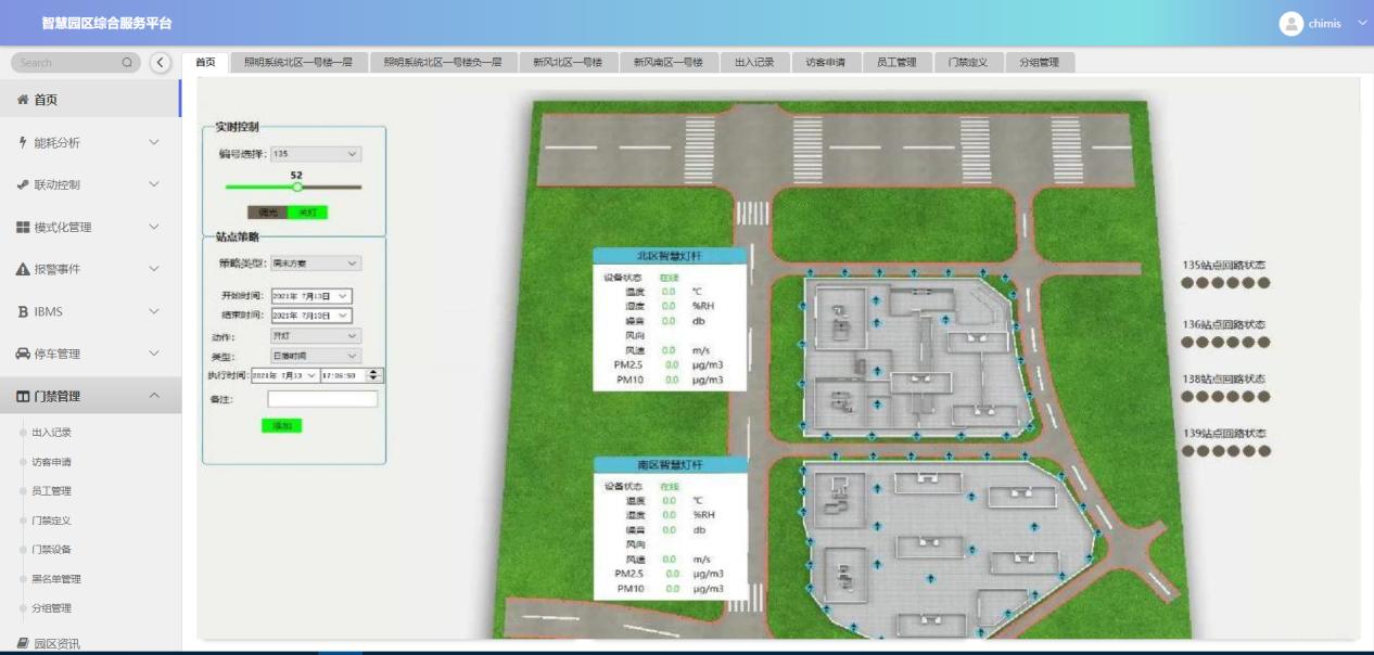 照明智能調節:室外照明結合光感規則,綜管平臺根據日出日落時間自動下發指令開閉室外燈桿;室內照明則在無訪客預約時段自動關閉展廳燈光。