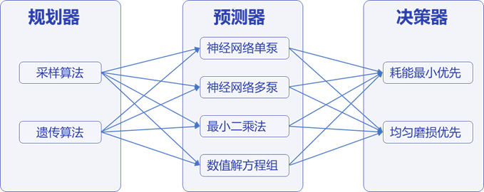 決策器根據控制器生成的方案與預測器對方案能耗及特性曲線的建模,選擇出滿足工況需要的且能耗最低的控制方案,包括選擇工作機器的編號及參數。