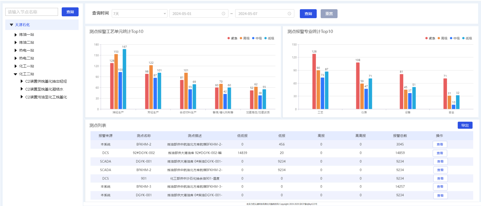 力控化工(?;罚┢髽I(yè)報(bào)警管理平臺(tái),基于力控一體化管控平臺(tái)而構(gòu)建,以收集各系統(tǒng)生產(chǎn)、報(bào)警等數(shù)據(jù),將時(shí)間作為統(tǒng)一對(duì)齊維度,進(jìn)行整定和標(biāo)準(zhǔn)化處理,完成信息補(bǔ)全,計(jì)算識(shí)別各報(bào)警點(diǎn)間的相關(guān)性,對(duì)報(bào)警源頭進(jìn)行重點(diǎn)監(jiān)測(cè)和控制。