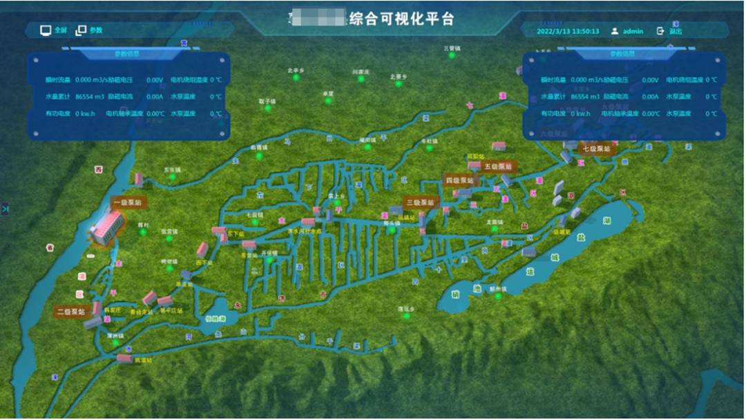 通過對泵站供水的地理位置信息進行3D繪制,精準展現地理布局,標注河道位置、走向及泵站位置。該系統實時接入泵站的電壓、電流、流量等運行數據,通過圖表直觀展示泵站狀態。