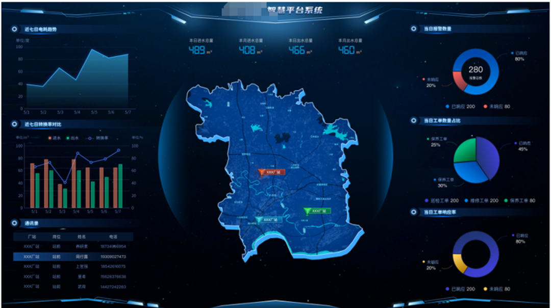 泵站駕駛艙是智慧運維系統的中樞,集成了實時監測、數據分析、應急指揮等核心功能。設計簡潔直觀,大屏幕可展示關鍵數據,支持從安全生產、運營目標、管理KPI等多個維度進行日常運行監測管理,便于管理者快速捕捉泵站運行狀態,并針對突發事件進行應急指揮調度管理。